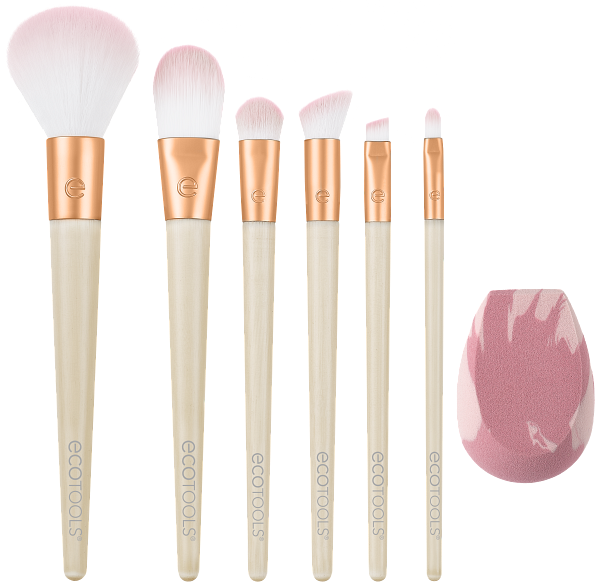 El juego de brochas y esponjas de maquillaje Wrapped In Glow incluye: (1) forro en ángulo, (1) brocha de base clásica, (1) pincel corrector de detalles, (1) licuadora perfeccionadora fresca, (1) cepillo de sombra completa, (1) pincel de polvo definitivo y (1) cepillo de micromezcla Fabricado con materiales reciclados: EcoTools cree en reducir los residuos mediante el uso de aluminio reciclado y plástico en nuestros productos