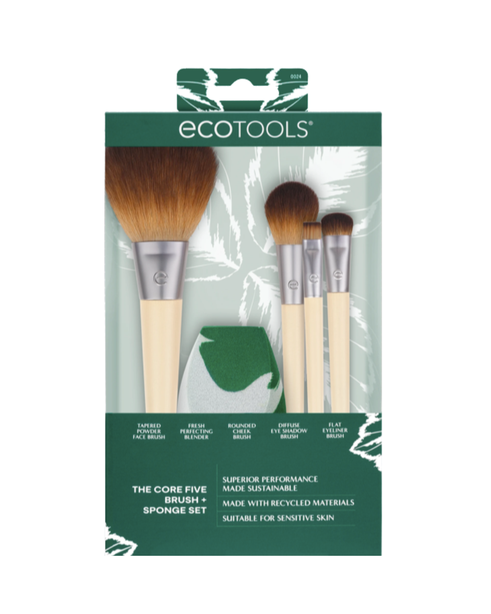 EcoTools El juego Core Five Brush + Sponge incluye: (1) cepillo difuso para sombra de ojos, (1) cepillo facial cónico para polvo, (1) licuadora perfeccionadora fresca, (1) cepillo para mejillas redondeadas, (1) pincel plano delineador de ojos El juego de brochas de maquillaje esenciales te ayuda a lograr un aspecto de maquillaje natural de cara completa con tu sombra de ojos líquida, crema y polvo favorita, rubor, bronceador, contorno, polvo fijador y delineador