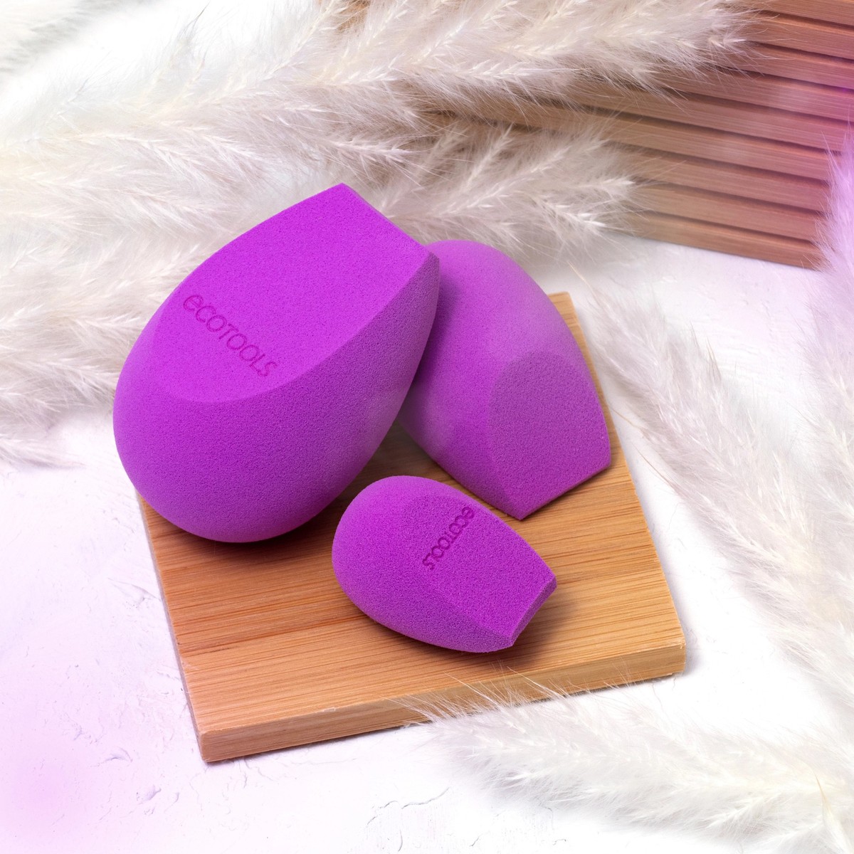 Incluye (3) bioblenders EcoTools en tamaño completo, mediano y mini Una esponja seca es mejor para una cobertura más completa y retoques Una esponja húmeda es mejor para un brillo puro y húmedo Fabricado con solo 5 ingredientes (agua, maíz, bionanopol, conservante natural y pigmento natural) .