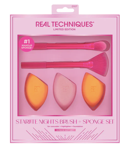 Real Techniques Juego de brochas y esponjas Starlite Nights de edición limitada, juego de brochas de maquillaje y esponjas de mezcla de maquillaje, para corrector, base y polvo, para piel mate o húmeda, juego de regalo de 5 piezas